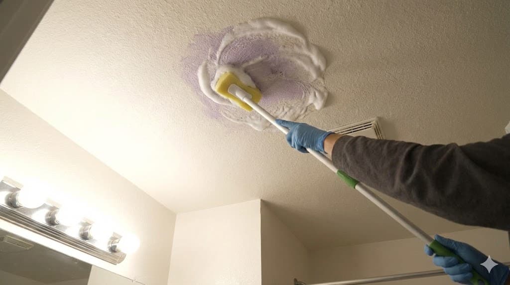 塩素系漂白剤は乾いてしまうと分解効果を失います。しかし、天井にラップをするのは危険で難しいため、「乾かないように塗り直す」という持久戦で挑みます。