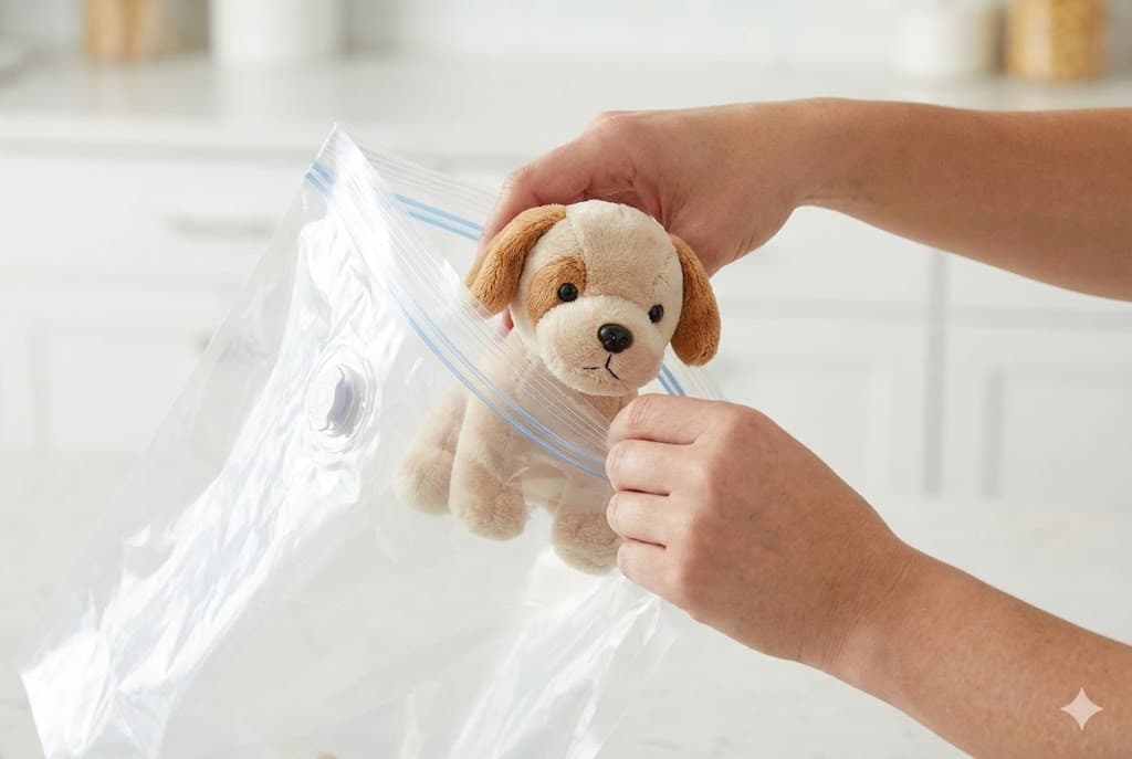 まずは、ぬいぐるみを大きめのビニール袋(ジップロックやポリ袋)に入れます。