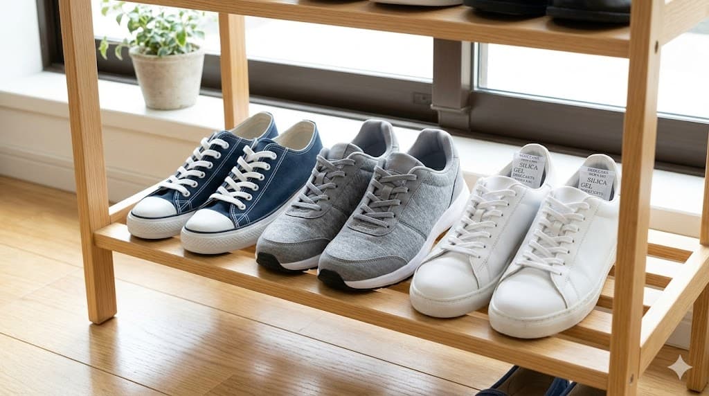 雨に濡れたら風通しの良い日陰でしっかり乾かすこと。また、靴箱に長期間しまう時は、除湿剤を一緒に入れたり、定期的に扉を開けて換気したりして、湿気をため込まないようにしましょう。