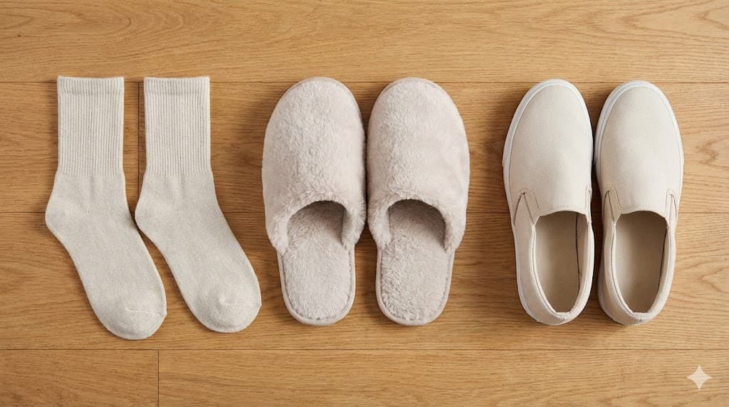 - 滑り対策重視: 滑り止め付きのルームシューズ(+100均インソールで完璧!)