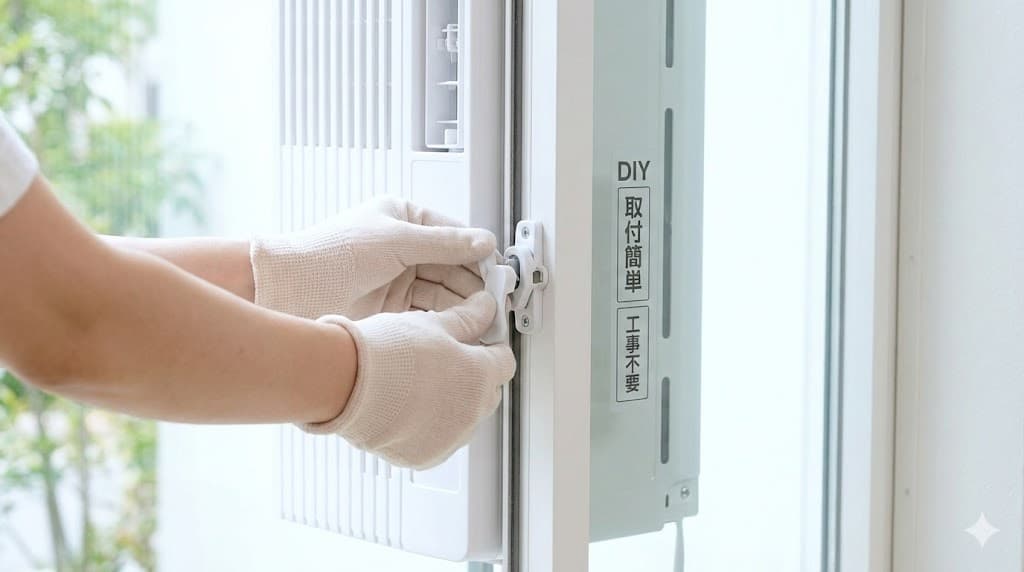 エアコンを挟み込むため、窓を完全に閉めることができなくなります。「補助錠」を使って窓を固定し、防犯対策をする必要があります。